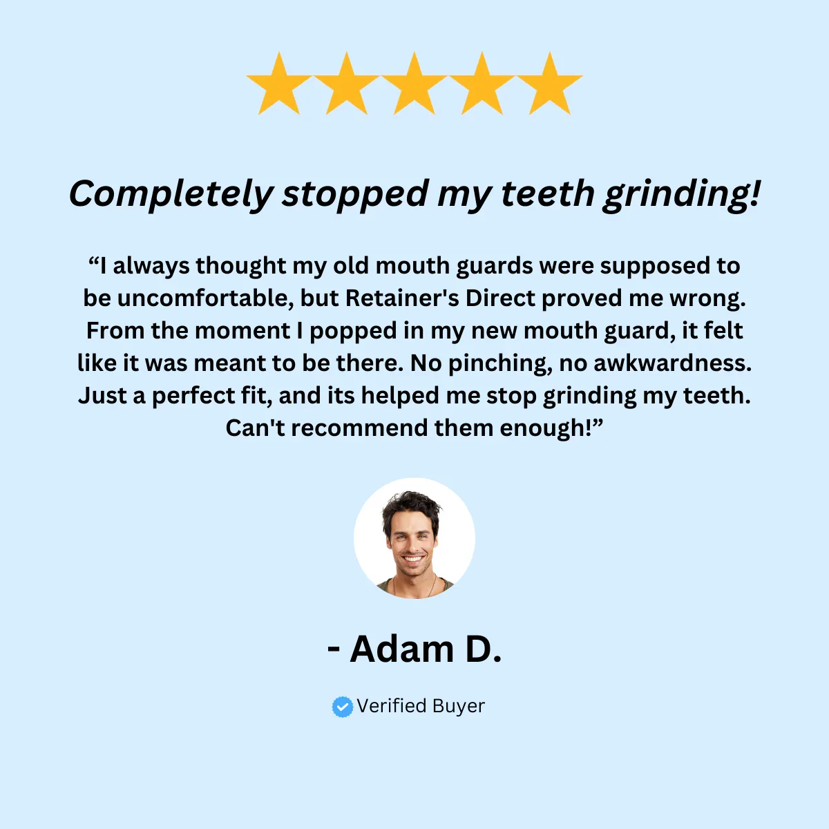 I’ve been dealing with teeth grinding for a long time and nothing seemed to help. I tried so many over-the-counter guards, but they were uncomfortable and ineffective. Then I found Retainers Direct, and it’s been a total game changer. The custom-fit night guard I received was easy to order, and the fit is perfect—like it was crafted just for me. No more waking up with a sore jaw or painful headaches. I couldn’t be happier with the results and highly recommend it to anyone who suffers from teeth grinding!