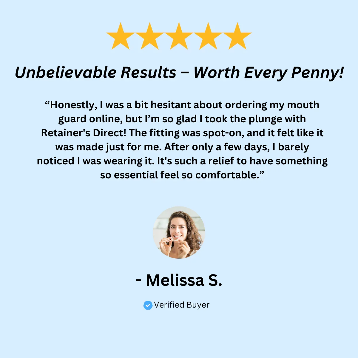 My dentist quoted me $450 for a custom night guard. I found Retainers Direct online and decided to try it instead—and I’m so glad I did! The process was smooth, the instructions were clear, and the fit is incredible. I’ve been using it every night, and it’s held up great. Can’t believe the quality for the price!